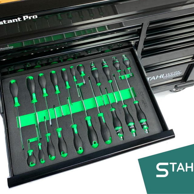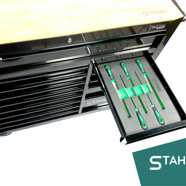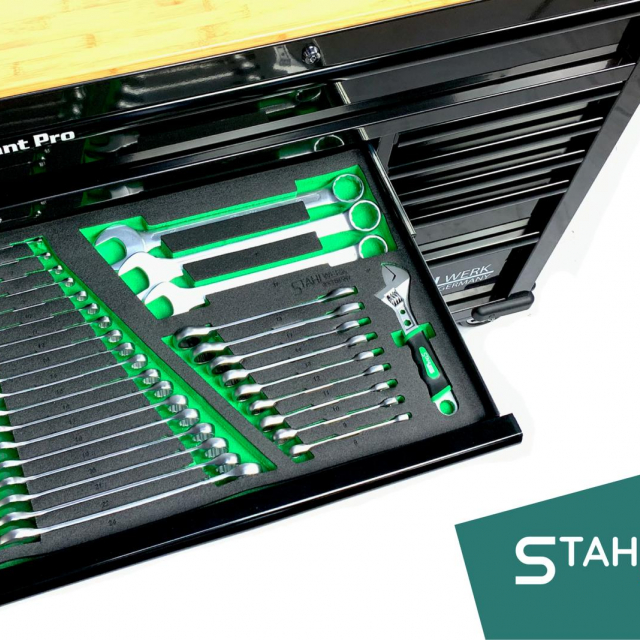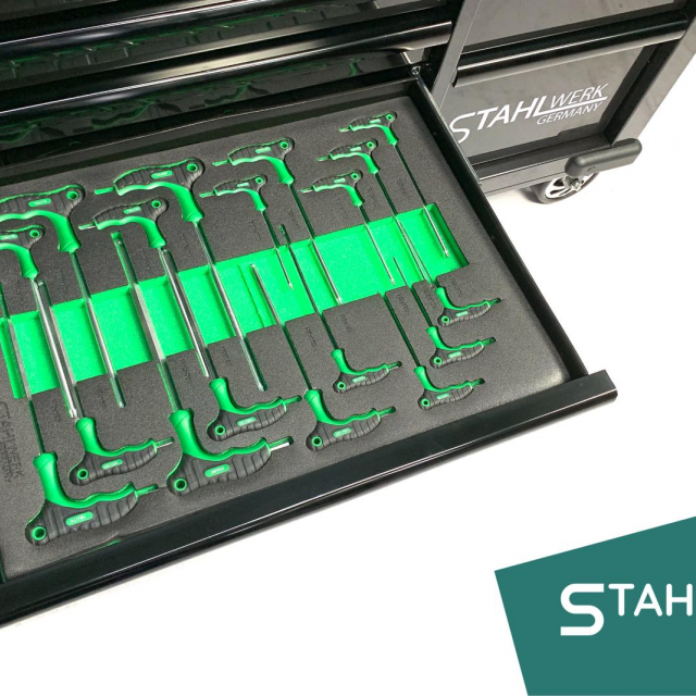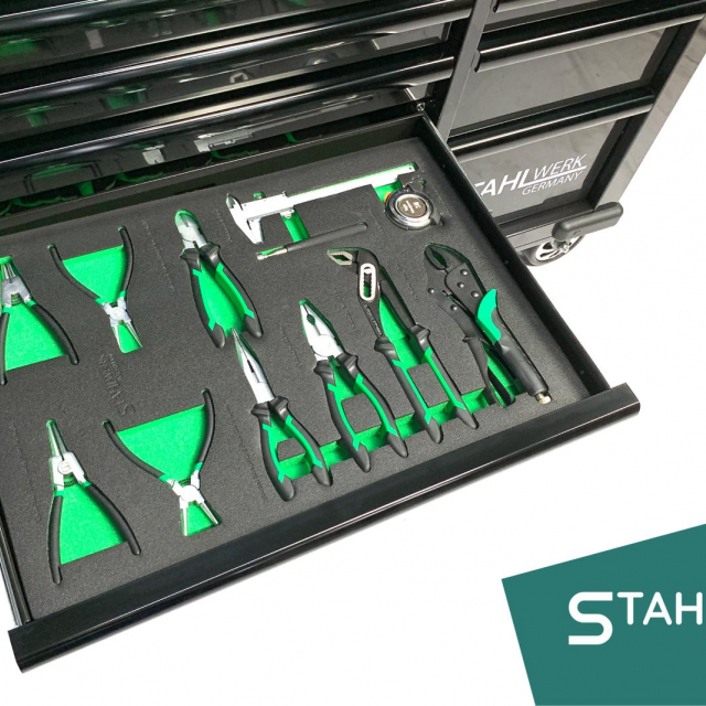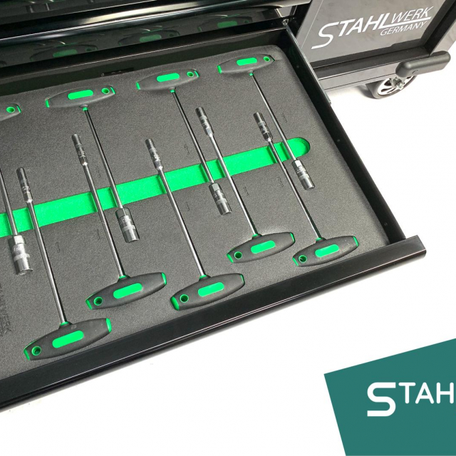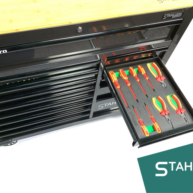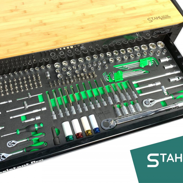 Het gereedschap zit opgeborgen in stevige schuimrubberen modules waardoor deze optimaal beschermd zijn. Door middel van de foam inlays kunt u na de werkzaamheden erg simpel zien of de gereedschapsset compleet is. Deze gereedschapswagen is simpel verplaatsbaar door de stevige stuurgreep en de robuuste vier wielen waarvan twee zwenkwielen met rem. Deze gereedschapswagen is geheel afsluitbaar door middel van 2 sleutels passend op het cilinderslot. De wagen beschikt over een extra sterk bamboehouten bovenblad.