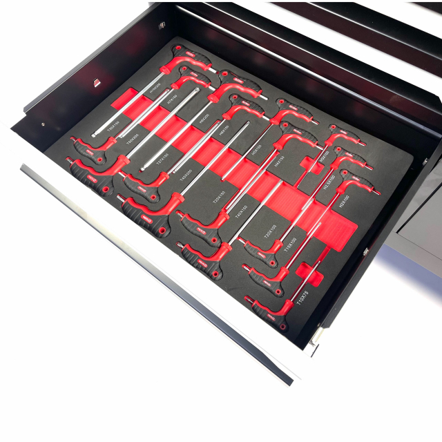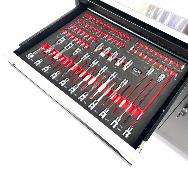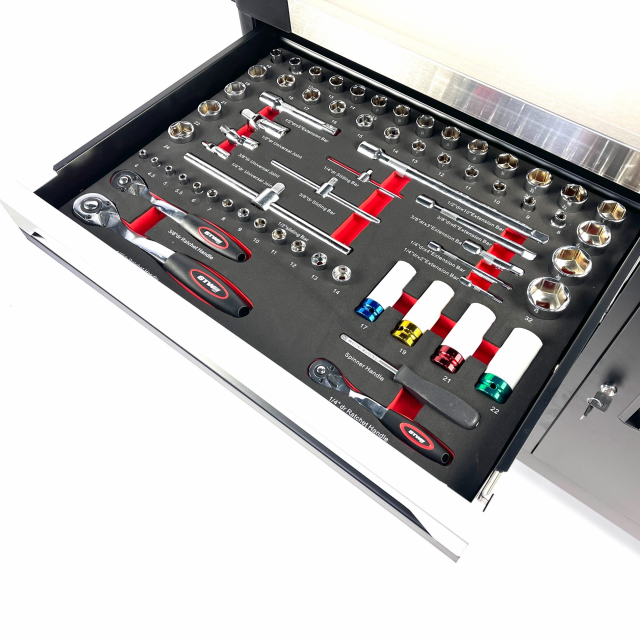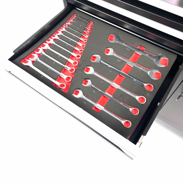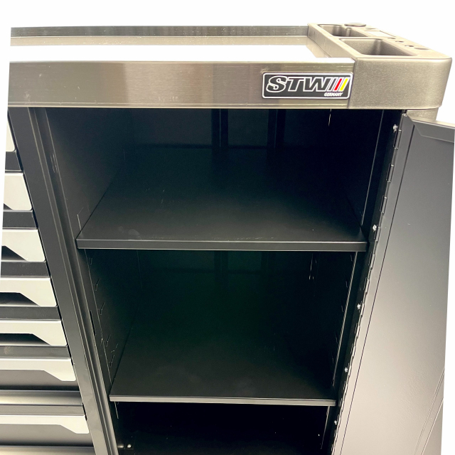 Deze STW XXL gereedschapswagen bij Stahlwerk beschikt over zeven kogelgelagerde laden waarvan 6 gevulde laden met gereedschap. Het gereedschap zit opgeborgen in zes stevige schuimrubberen modules waardoor deze optimaal beschermd zijn. Door middel van de foam inlays kunt u na de werkzaamheden erg simpel zien of de gereedschapsset compleet is. Deze gereedschapswagen is simpel verplaatsbaar door de stevige stuurgreep en de robuuste vier wielen waarvan twee zwenkwielen met rem. Deze gereedschapswagen is geheel afsluitbaar door middel van 2 sleutels passend op het cilinderslot. De wagen beschikt over een extra sterk roestvrijstaal bovenblad.
