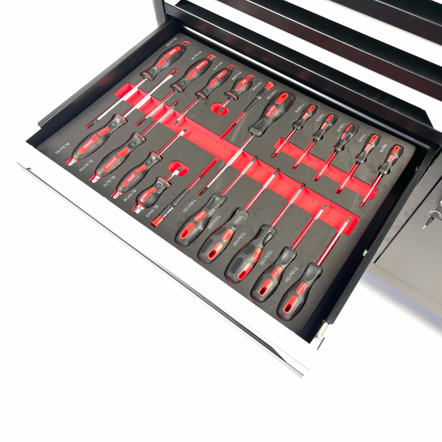 In deze  gereedschapswagen vindt u een uitgebreid 295-delig gereedschapset met onder andere een compleet doppenset met ratels in drie verschillende opnames: 1/2″, 1/4″ en 3/8″. De schroevendraaiers in deze gereedschapswagen zijn van professionele kwaliteit en op de kop voorzien van een zeskant voor extra kracht te zetten met een sleutel of hamer.