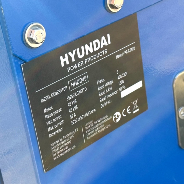 Dit model beschikt over een 1500 RPM motor die 45 KVA kan leveren. Dit vermogen kan hij tot wel 8 uur lang leveren dankzij de zuinige Hyundai Diesel motor die van topkwaliteit is. Doordat deze generator over een waterdicht baldakijn beschikt zal hij in weer en wind kunnen presteren. Dit is natuurlijk waar elke vakman op zit te wachten: Een krachtige machine die op elk moment de kracht levert die een vakman nodig heeft. Deze Hyundai generator beschikt over een voltage van 400/230 en heeft een batterij met 60 Ah capaciteit. Verder beschikt deze generator over een tank van 93 liter, dit houd in dat hij met zijn verbruik van 10,7 liter ongeveer 8 en een half uur energie kan leveren.