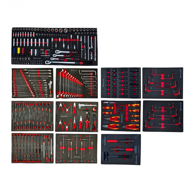 In deze gereedschapswagen vindt u een uitgebreid 755 delig gereedschapset met onder andere een compleet doppenset met ratels in drie verschillende opnames: 1/2″, 1/4″ en 3/8″. De schroevendraaiers in deze gereedschapswagen zijn van professionele kwaliteit en op de kop voorzien van een zeskant voor extra kracht te zetten met een sleutel of hamer.